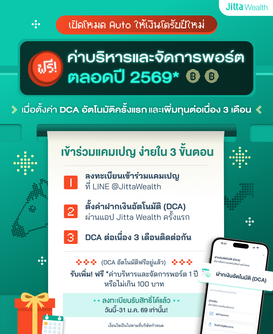 1. สิทธิพิเศษนี้สำหรับนักลงทุน Jitta Wealth ที่ทำการลงทะเบียนยอมรับเงื่อนไขการเข้าร่วมแคมเปญเท่านั้น ระยะเวลาลงทะเบียนตั้งแต่วันที่ 1 ธันวาคม 2568 เวลา 00:01 น. ถึง วันที่ 31 มกราคม 2569 เวลา 23:59 น.