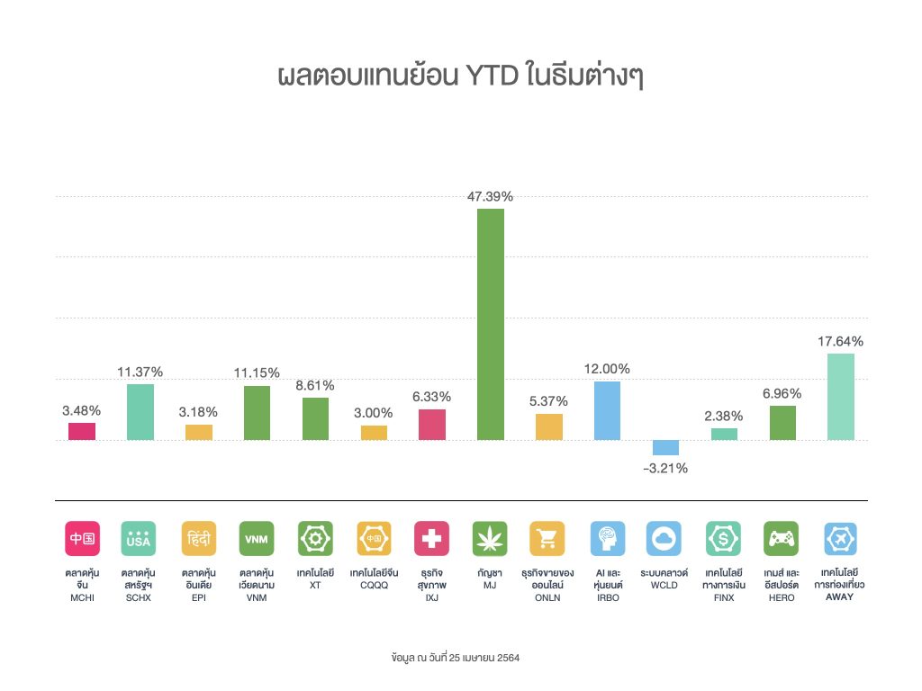 ส่วนธีมที่มีการเติบโตสูง คือ ธีมกัญชา ที่มาจากกระแสข่าวปลดล็อกให้ใช้กัญชาถูกกฎหมาย และธีมเทคโนโลยีท่องเที่ยว ที่มีทิศทางฟื้นตัวจากวัคซีน Covid-19