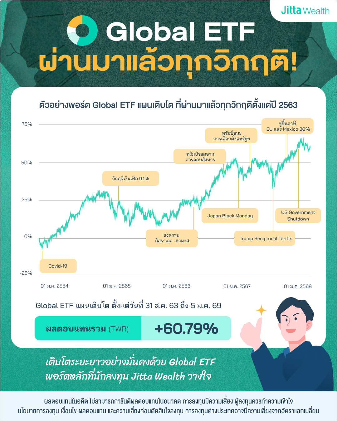 สิ่งที่ Global ETF ได้พิสูจน์ให้เห็นคือ การออกแบบพอร์ตให้สามารถรับมือกับความผันผวนของเศรษฐกิจโลก และยังคงเดินหน้าต่อได้ในระยะยาว