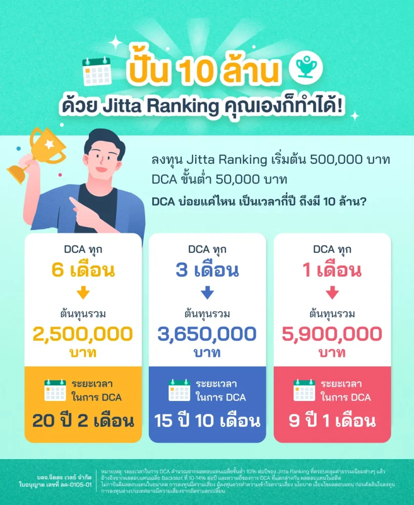 ระยะเวลาในการ DCA คำนวณจากผลตอบแทนเฉลี่ยขั้นต่ำ 10% ต่อปีของ Jitta Ranking ที่ครอบคลุมค่าธรรมเนียมต่างๆ แล้ว อ้างอิงจากผลตอบแทนเฉลี่ย Backtest ที่ 10-14% ต่อปี และความถี่ของการ DCA ที่แตกต่างกัน ผลตอบแทนในอดีต ไม่การันตีผลตอบแทนในอนาคต การลงทุนมีความเสี่ยง ผู้ลงทุนควรทำความเข้าใจความเสี่ยง นโยบาย เงื่อนไขผลตอบแทน ก่อนตัดสินใจลงทุน