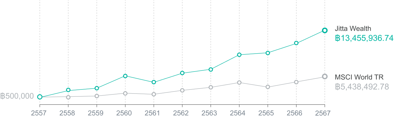 ผลตอบแทนของการลงทุนเริ่มต้นด้วยเงิน 2 ล้านบาท จากการทดสอบผลตอบแทนย้อนหลัง (Back Test) อัปเดต ณ วันที่ 19 พฤศจิกายน 2567 เป็นผลตอบแทนสุทธิจากการลงทุนตามนโยบาย Jitta Ranking Alpha รวมส่วนต่างราคา (Capital Gain) และเงินปันผล (Dividend) หักค่าธรรมเนียมบริหารจัดการรายปี (Management Fee) ค่าธรรมเนียมตามกำไร (Performance Fee) ค่าธรรมเนียมการซื้อขาย (Commission Fee) และค่าธรรมเนียมผู้รักษาทรัพย์สิน (Custodian Fee) แล้ว