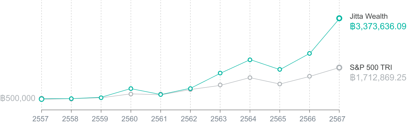 ผลตอบแทนเฉลี่ยของการลงทุนเริ่มต้นด้วยเงิน 5 แสนถึง 1 ล้านบาท จากการทดสอบผลตอบแทนย้อนหลัง (Back Test) ที่ปรับพอร์ตทุก 3 เดือน อัปเดต ณ วันที่ 1 เมษายน 2568 เป็นผลตอบแทนสุทธิจากการลงทุนตามนโยบาย Jitta Ranking ในแต่ละประเทศ รวมส่วนต่างราคา (Capital Gain) และเงินปันผล (Dividend) หักค่าธรรมเนียมบริหารจัดการรายปี (Management Fee) ค่าธรรมเนียมตามกำไร (Performance Fee) ค่าธรรมเนียมการซื้อขาย (Commission Fee) และค่าธรรมเนียมผู้รักษาทรัพย์สิน (Custodian Fee) แล้ว
