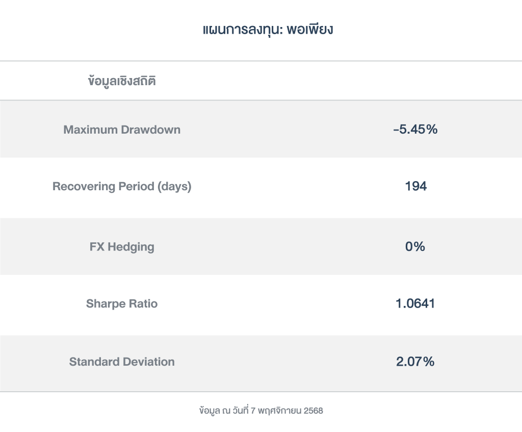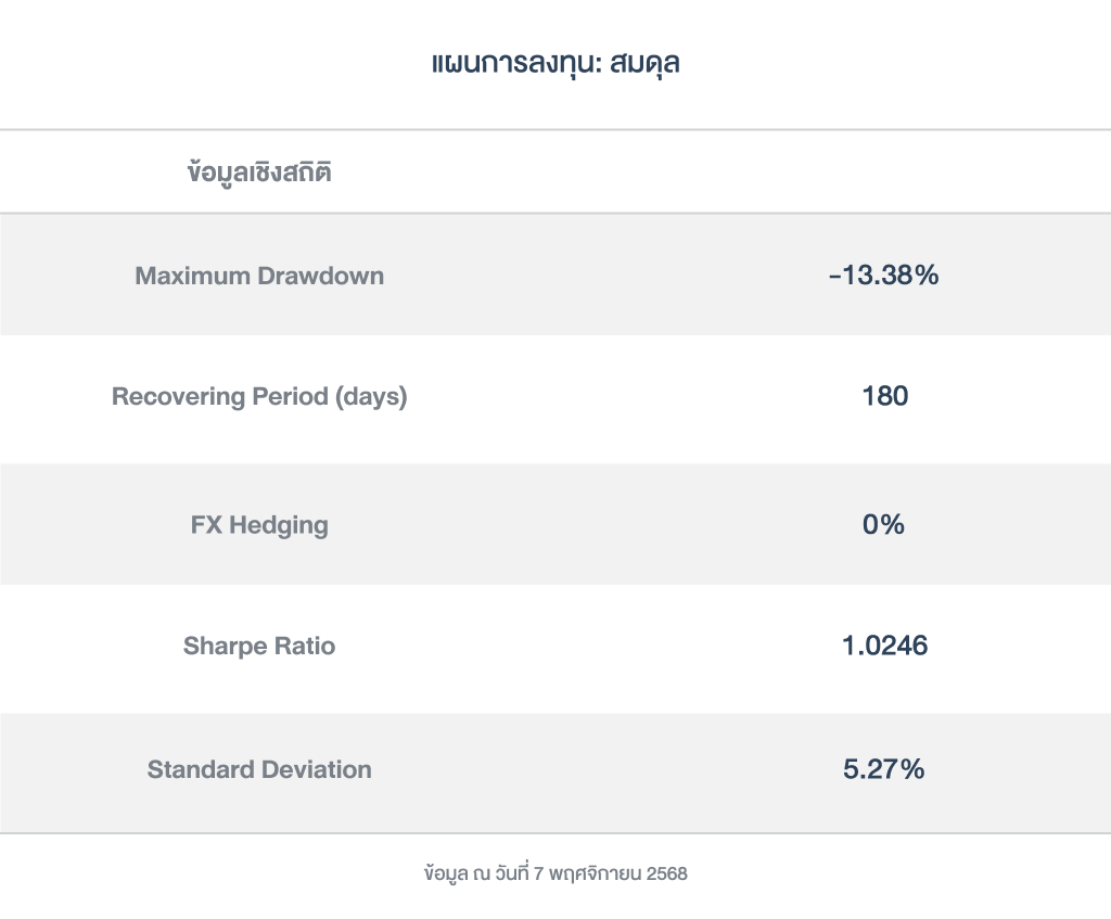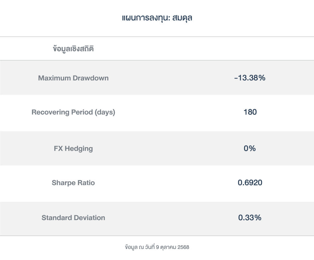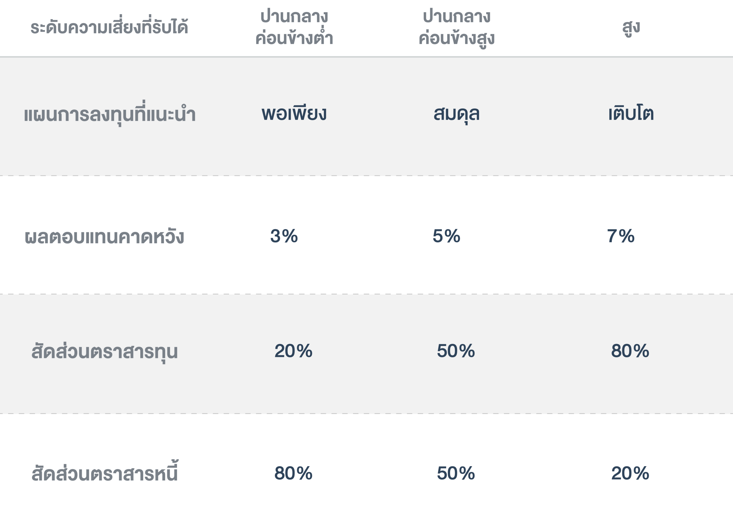 - เหมาะกับ นักลงทุนที่มีระยะเวลาลงทุนปานกลางถึงยาว และต้องการพอร์ตที่สมดุลระหว่างผลตอบแทนและความเสี่ยง