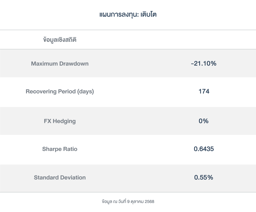 - เหมาะกับ นักลงทุนที่มีระยะเวลาลงทุนยาว และเน้นสร้างความมั่งคั่งในอนาคต