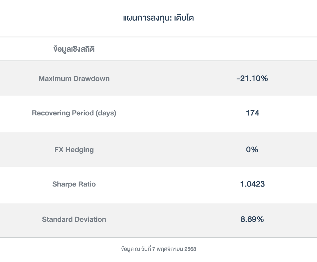 - เหมาะสำหรับนักลงทุนที่สามารถ รับความผันผวนของตลาดได้สูง และมีเป้าหมายในการเติบโตของเงินลงทุนระยะยาว