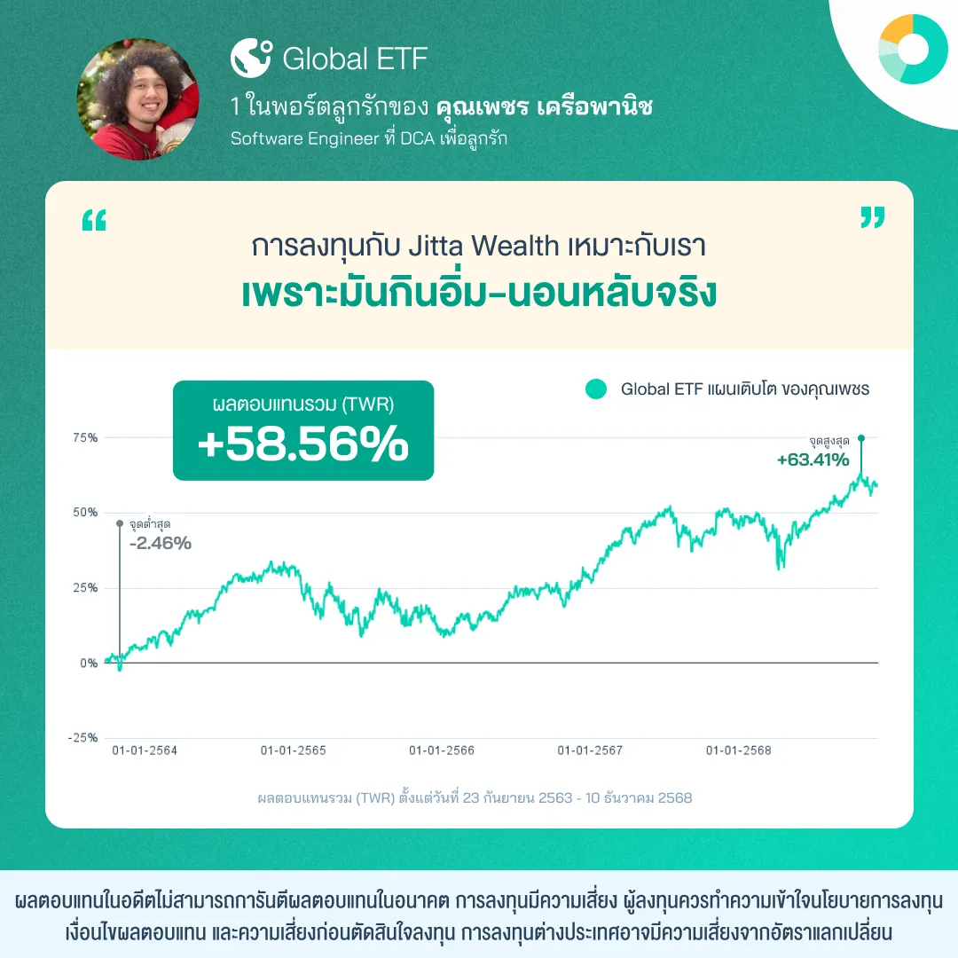 เช่นเดียวกับคุณเพชร เครือพานิช Software Engineer องค์การมหาชน ที่ปรับเป้าหมายการลงทุนใน Global ETF ของเขาจากพอร์ตเกษียณเป็นพอร์ตเพื่อลูกรัก ด้วยผลตอบแทน 58.56% ณ วันที่ 23 ก.ย. 63 – 10 ธ.ค. 68 เอาชนะ Morningstar Global 80/20 ที่อยู่ที่ 24.99%
