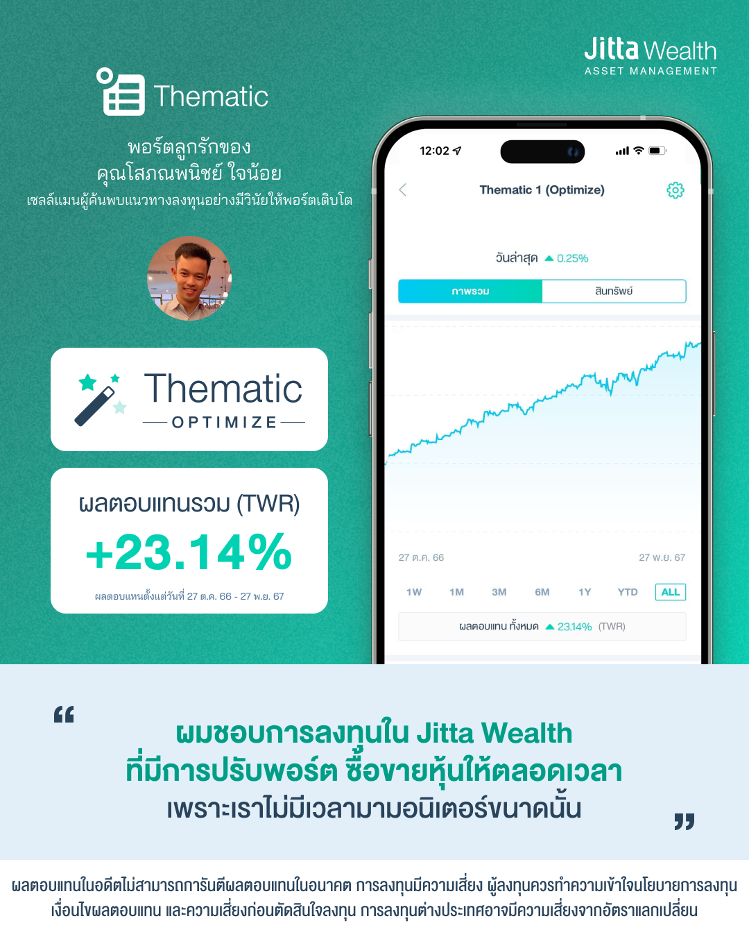 คุณโสภณพนิชย์สนใจการลงทุนใน ETF เป็นทุนเดิม จึงสนใจเปิดพอร์ตทั้ง Thematic Optimize และ Global ETF แต่ด้วยเงินลงทุนขั้นต่ำที่ต้องเริ่มต้นที่ 1 หมื่นบาท และเพิ่งทำความรู้จักกับ Jitta Wealth เขาจึงเลือกเปิด Thematic Optimize ก่อนเป็นพอร์ตแรก เพราะส่วนตัวมองว่าเป็นการลงทุนตามกระแสแศรษฐกิจโลก เติบโตได้ในอนาคต และเมื่อเรียนรู้กันมาได้ปีกว่า คุณโสภณพนิชย์ก็ได้เปิดพอร์ต Global ETF ตามมาอีกพอร์ต